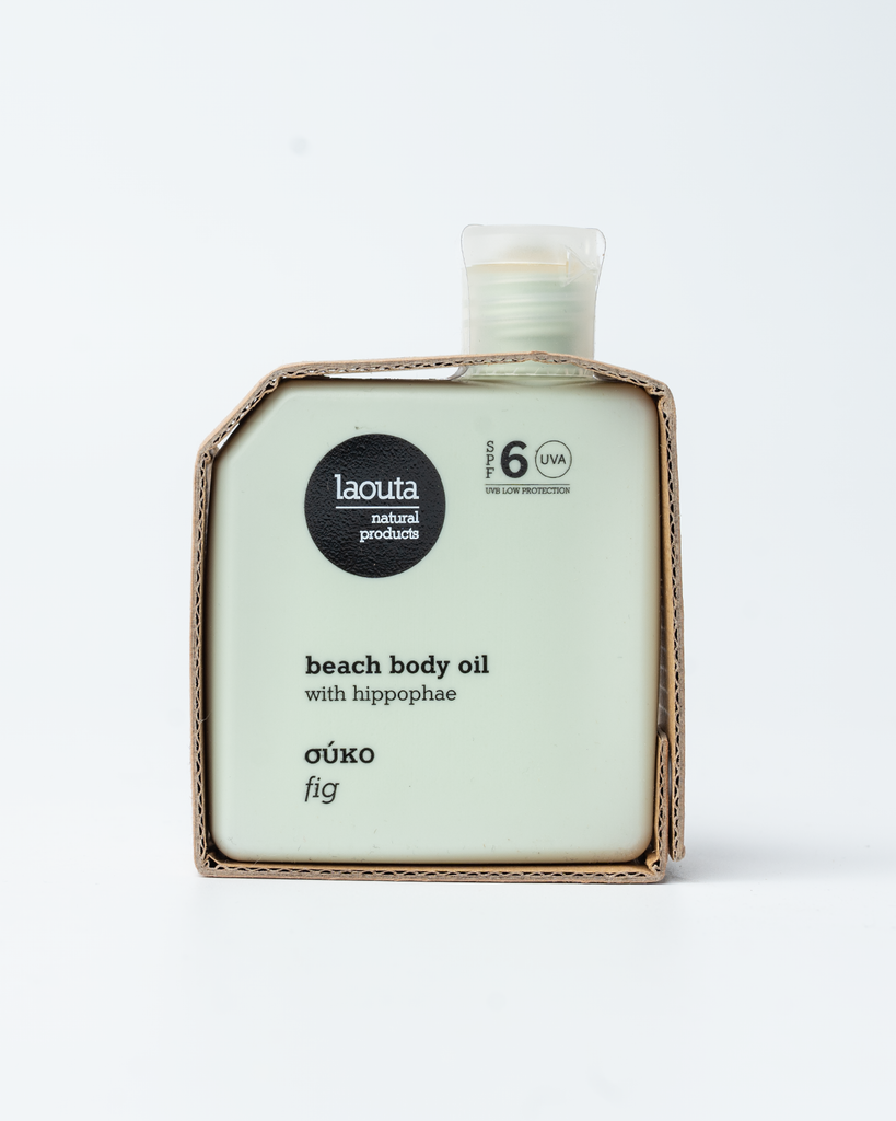 Natural beach body oil with cacao or fig or mastic and hippophae. Enriched with herbal extracts and nutritional oils, while hydrating and protecting the skin from UVA and UVB rays, it offers a vibrant golden long lasting tanning.