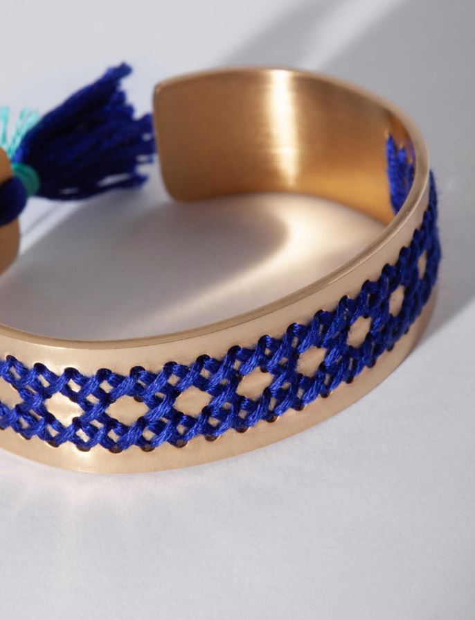Gold plated recycled brass with anti-tarnish finishing. Open bracelets are semi-adjustable, bend them gently to fit the size of your wrist. Each item is unique and hand stitched by hand with cotton DMC embroidery floss.