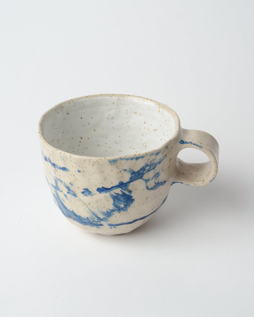 An elegant mug, made by pinch pot technique entirely shaped by hand, stands out for its linear free style design. Decorated in the exterior with blue cobalt lines and fired at 1240 ℃ with a transparent glossy glaze, which allows the speckles of the clay to shine thru, this mug exudes harmony, calm, and authentic beauty to your space.