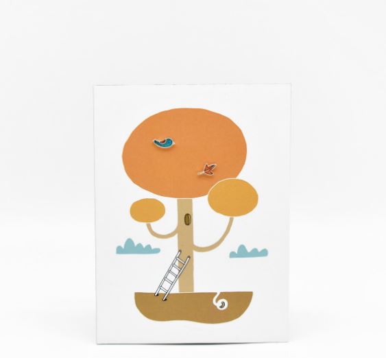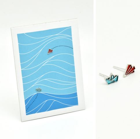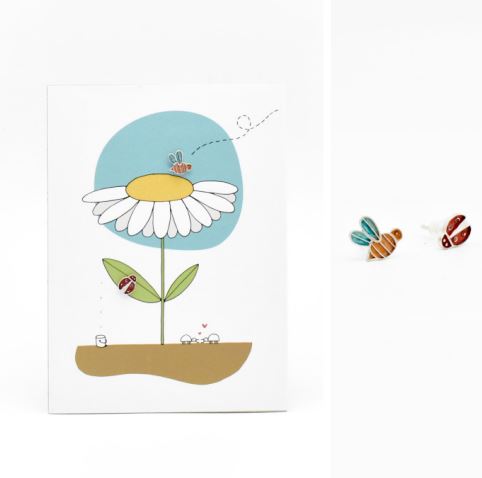 Handmade pair of stud earrings, silver and colored, on an illustrated card.