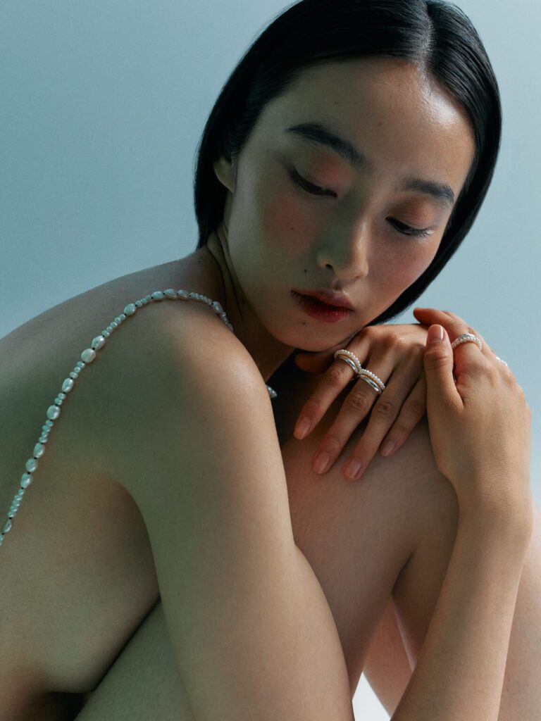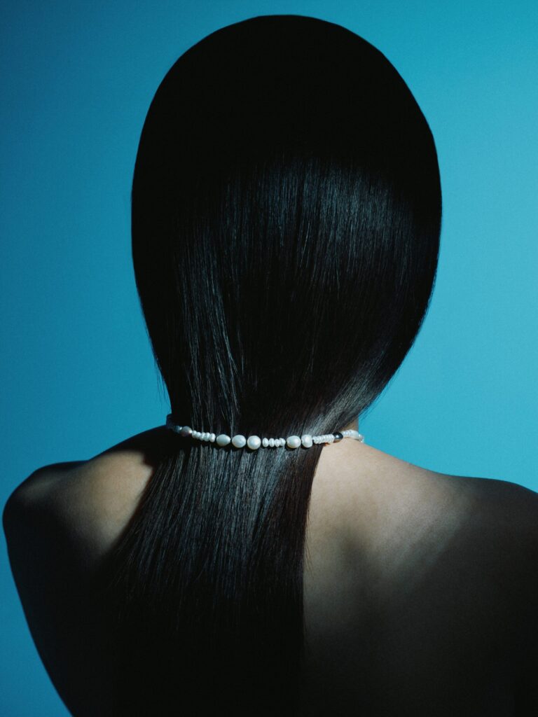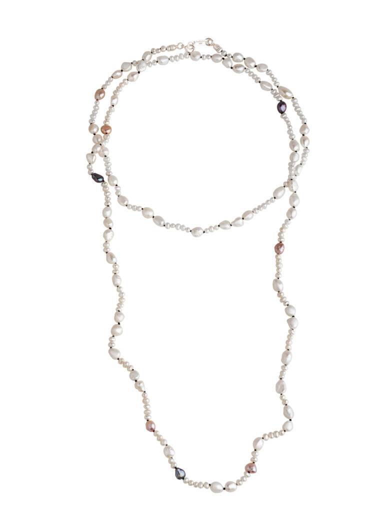 Handmade necklace consisting of freshwater pearls, white corals and hematite.