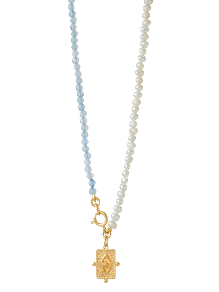 A handmade necklace consists of half of pearls and half of aquamarine stones.