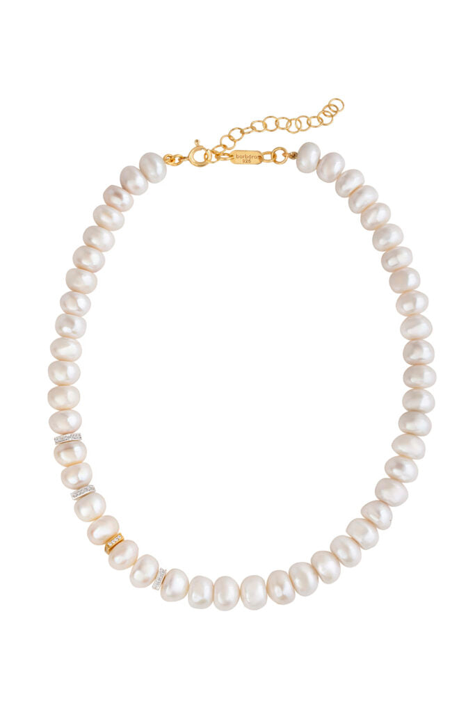 Handmade in Greece. Made from 100% recycled silver 925 double plated with 18 and 24 karat gold. Necklace consists of button style pearls and squared pave charms with clear white zircon stones.