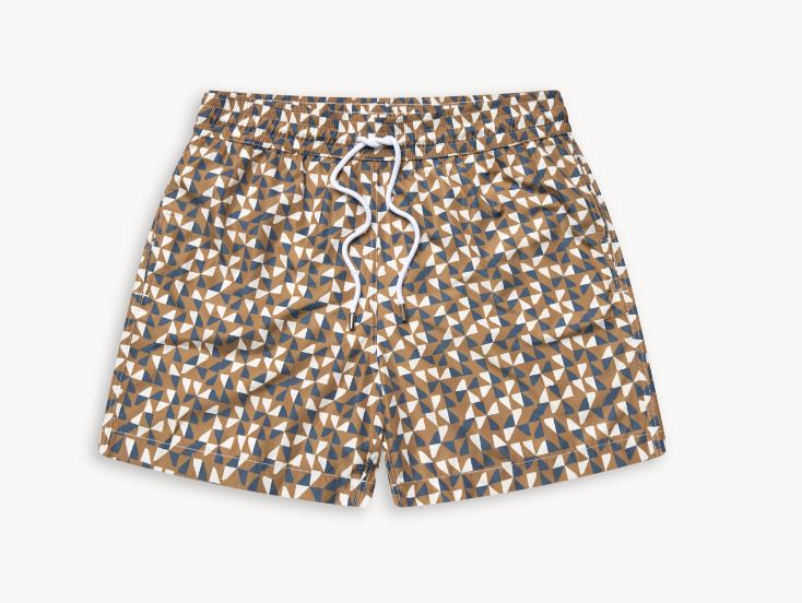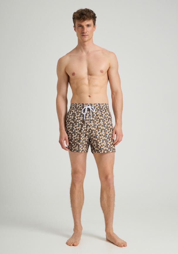 The Mylos Swim Shorts blend modern ease with refined craftsmanship, featuring an exclusive in-house motif inspired by the iconic windmills of the Greek islands. Crafted from quick-drying, Italian-woven fabric, they offer a relaxed mid-length fit, breathable inner mesh lining, and an elasticized drawstring waistband with branded cord ends for all-day comfort. Two side pockets and a tailored back pocket with a branded button add everyday versatility, making them a go-to essential from seaside lounging to city strolls.